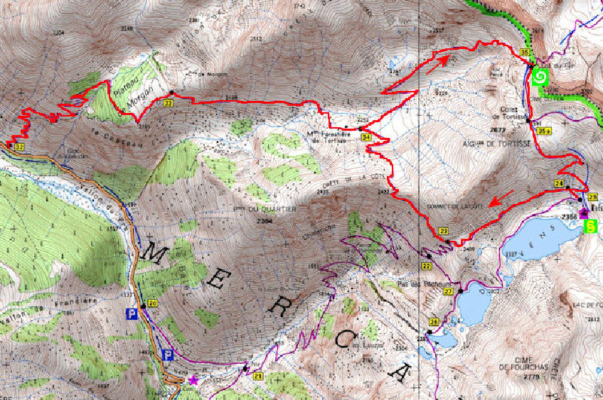 La randonnée s’annonce difficile dès le départ. Au bord de la route du Pra, l’ascension commence tout de suite. On atteint le Plateau de Morgon où un pont enjambe le petit ruisseau. A la maison forestière de Tortisse on continue en direction du Col du Fer d’où on voit au nord la pyramide du Mont Viso qui se dresse. Plus que 10 minutes jusqu’au Collet de Tortisse. Avant d’entamer la descente, on peut faire deux crochets : l’un court en montant à droite sur les Aiguilles de Tortisse avec vue sur le plus haut des lacs, et/ou, un peu plus long par la Cime des Blanches qui offre le merveilleux spectacle des Lacs en cascades de Vens.